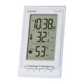 - 大きな画面で時刻と温度、湿度を一度に確認できます。スヌーズ機能付き目覚まし機能つき。