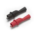 2つのスライド式ワニ口クリップ (赤、黒) と、柔軟性のあるブーツで保護された開口部8 mmの