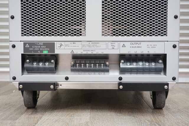三相モデル 電力容量:4.5kVA、形式:三相4線(Y結線)、出力レンジ:100V/200V、出力電圧:0~160.0V/0~320.0V、最大電流:15A/7.5A、周波数設定範囲:40.00~550.00Hz(ACモード)、1.00Hz~550.00Hz(AC+DCモード)、オプション:PA-001-1722、PA-001-1723、PA-001-1725、PA-001-2965