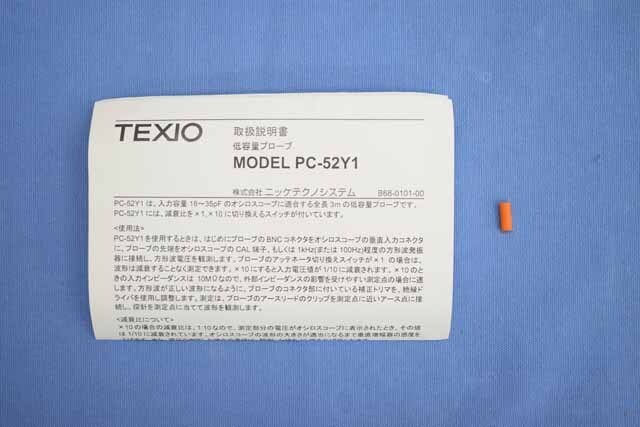 定格(入力抵抗1MΩのオシロスコープに接続した場合) 減衰比×10 入力抵抗:10MΩ、入力容量:21pF、周波数特性:DC~40MHz、適合容量:18~35pF、最大入力電圧:600V(DC+ACpeak)CATII、 減衰比×1 入力抵抗:1MΩ、入力容量:プローブ単体で200pF以下、周波数特性:DC~500kHz、適合容量:―、最大入力電圧:400V(DC+ACpeak)CATII、全長:3m